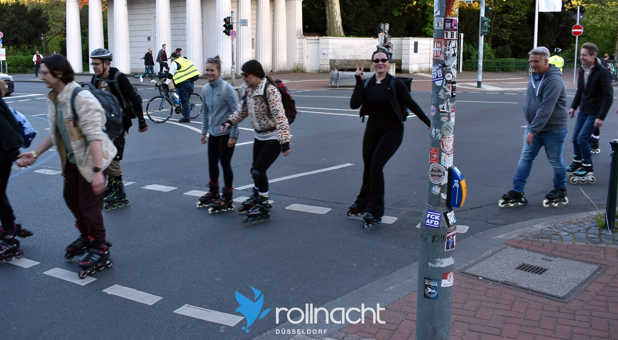 Wir fahren im Rahmen einer Sondergenehmigung auf öffentlichen Straßen. Das Skaten im Rahmen der Rollnacht ist den Teilnehmern NUR auf den Straßen erlaubt, NICHT auf den Bürgersteigen, da dies die Unfallgefahr unnötig erhöht.